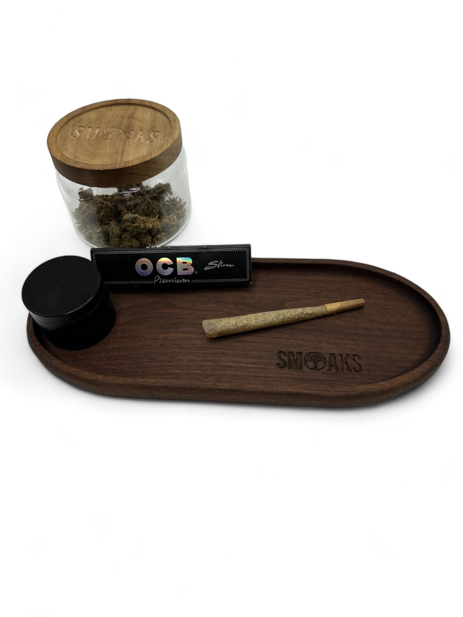 Oval Weed Handmade Black Walnut Rolling Tray with Airtight Storage Jar – Premium Cannabis Accessory