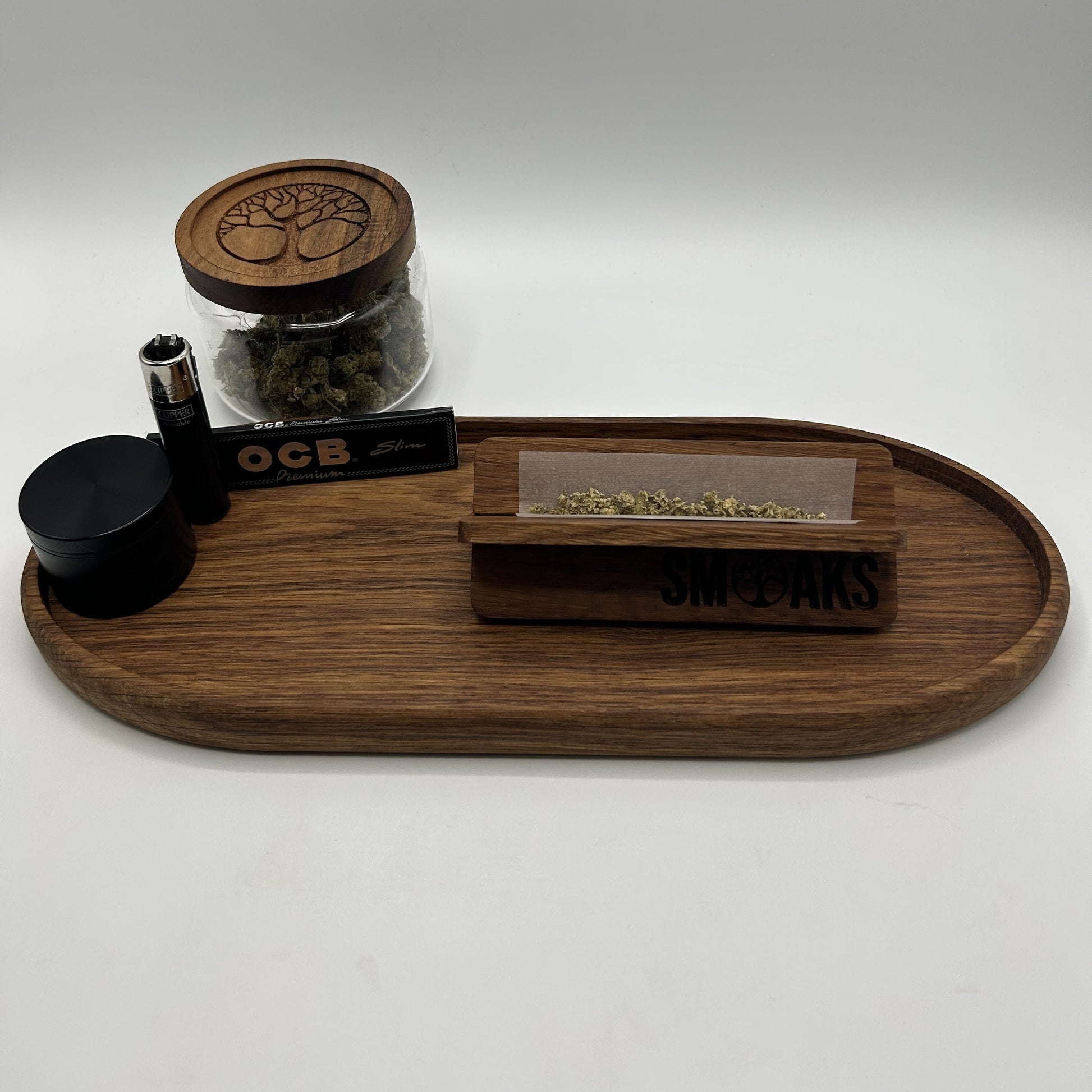 The kit includes thoughtfully selected accessories to complete your smoking ritual. It has a perfectly shaped rolling surface, and a sleek, durable finish that showcases the natural elegance of French Oak. Each element is carefully curated to provide a seamless and enjoyable experience.